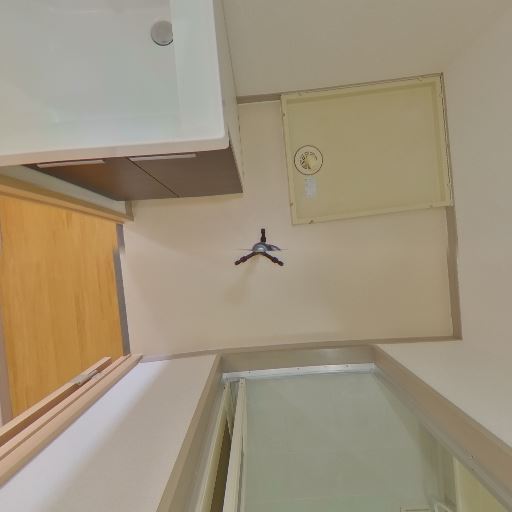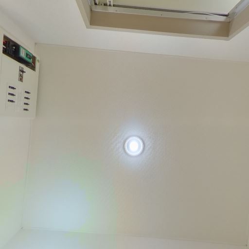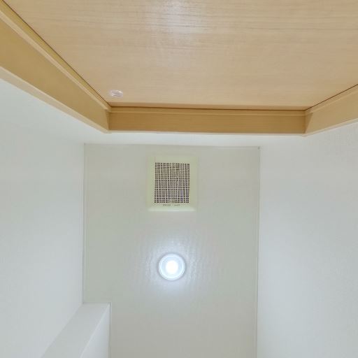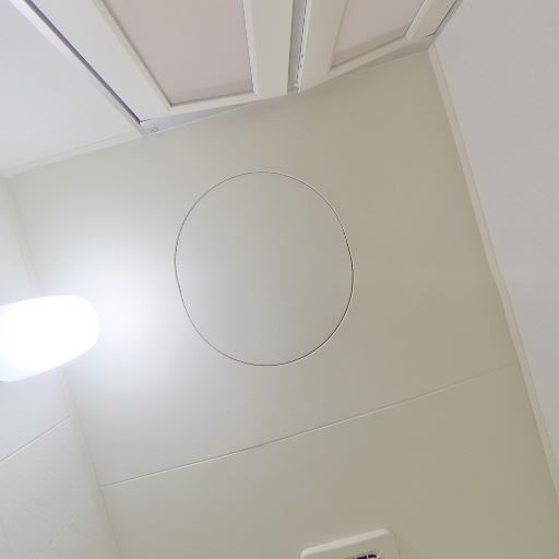 換気と照明(確度90%):天井に丸型の照明と換気口(または換気扇グリル)が確認できる。