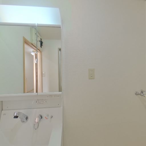 独立洗面台あり(確度82%):鏡付きの独立洗面台が設置されている。蛇口や操作パネルも新しめに見える。