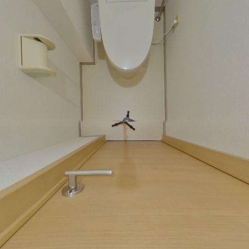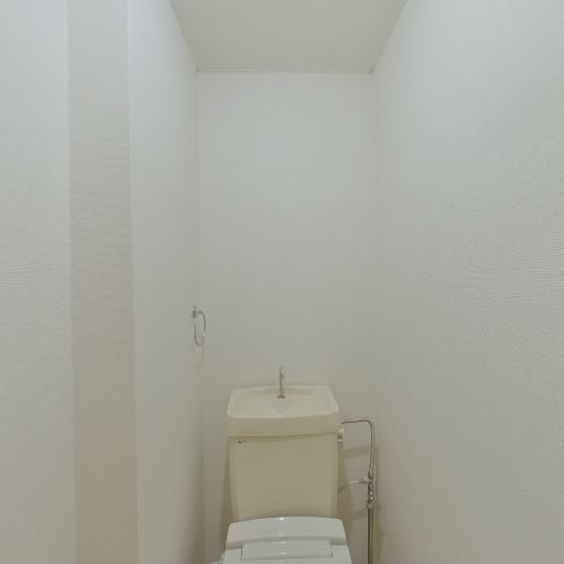 収納・棚の有無(確度73%):便器左側の壁に小さなカウンター状の棚がある。トイレットペーパーや小物置きに使えそう。