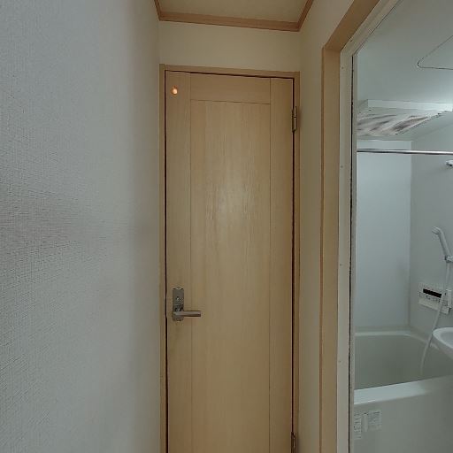 独立バスルームあり(確度76%):浴槽・シャワー・洗面が同一空間のユニットタイプで、脱衣スペースと隣接。
