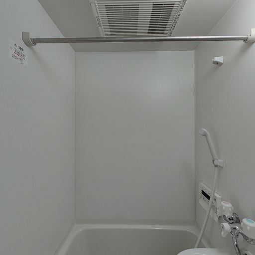 浴室乾燥・換気設備あり(確度88%):天井に換気扇、物干しポールが見える。湿気対策や室内干しに使えそう。