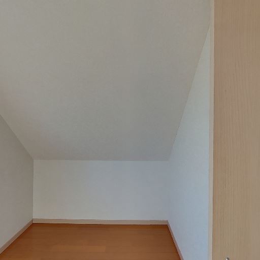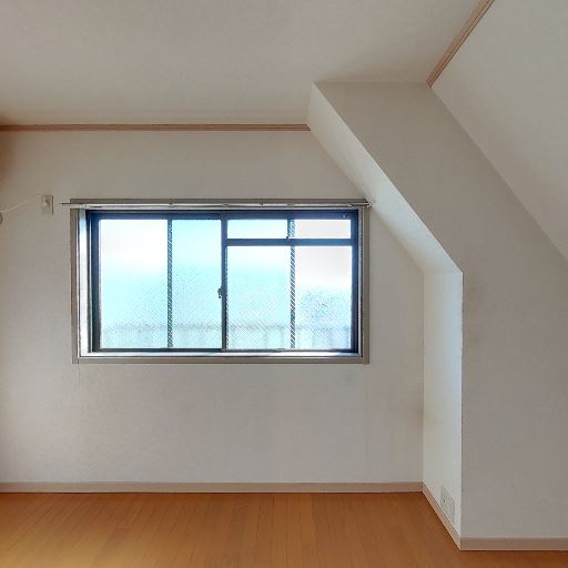 勾配天井による圧迫感/レイアウト制限(確度88%):一面が大きく斜めになった勾配天井で、壁際の有効高さが低い。背の高い家具配置は制限される。