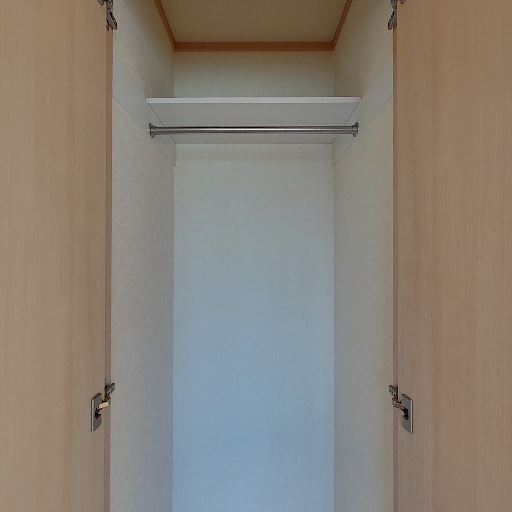 クローゼットの収納(確度88%):ハンガーパイプと上部棚がある奥行きのあるクローゼットが確認できる。