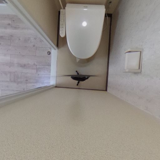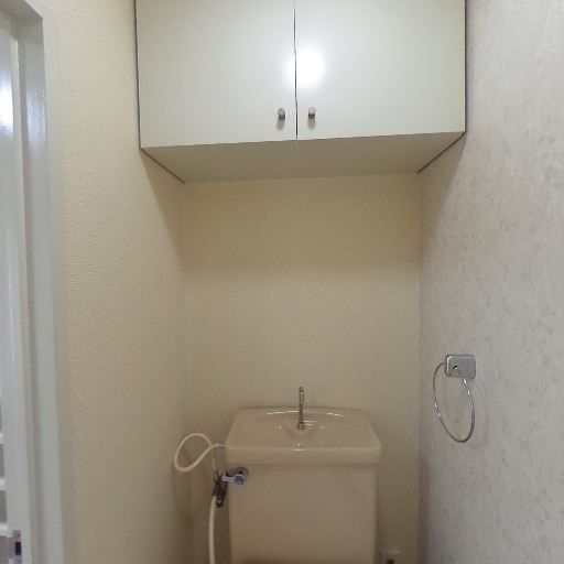 • トイレ上部に収納がある(確度95%):便器上の壁面に扉付きの吊戸棚が設置されており、トイレットペーパーや掃除用品の収納に使えそうである。