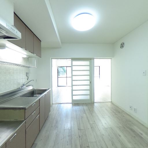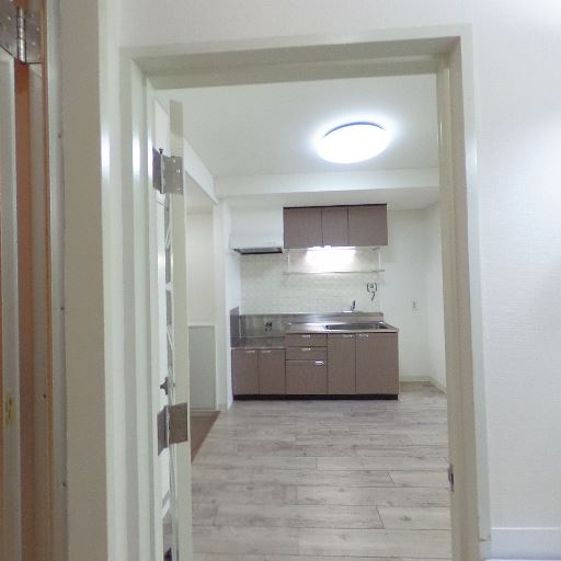 • 室内が明るく開放感がある(確度90%):隣接する居室側の開口部から強い自然光が入っており、キッチン周辺まで明るさが届いている。白系の壁・建具と明るい床材も相まって、全体的に明るい印象を受ける。