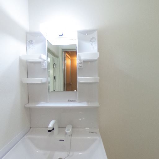• 独立洗面台がある(確度95%):正面に収納付きの独立洗面台が設置されており、鏡まわりにも小物を置ける棚がある。