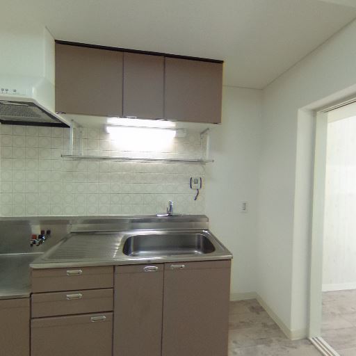 • キッチン設備はシンプルで必要十分(確度84%):シンク、コンロ脇の作業スペース、上部収納、レンジフードが確認でき、最低限の調理設備は整っている。
