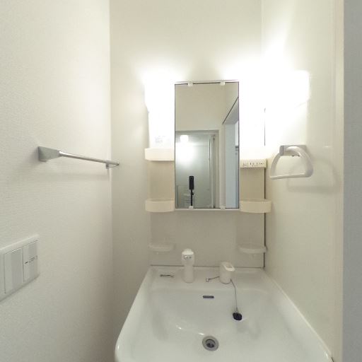 独立洗面台と収納(確度86%):ミラー付きの独立洗面台で、左右に小物棚とタオル掛けがあり使い勝手が良さそう。