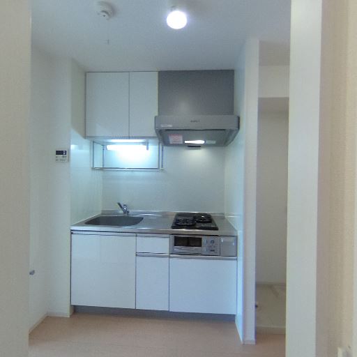 2口ガスコンロのキッチン(確度90%):シンクと2口コンロ、レンジフードが揃ったコンパクトなキッチン。下部・上部に収納も見える。