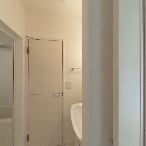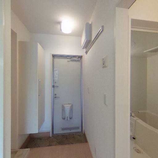 サニタリーの動線(確度74%):玄関からバス・洗面・トイレ方向へ続く廊下で、浴室や洗面が近接している。