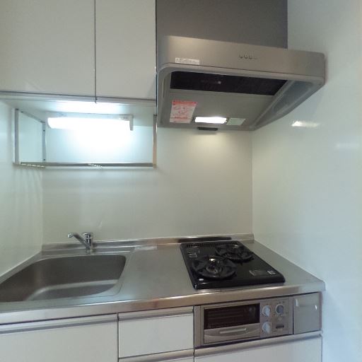 キッチンの充実度(確度86%):2口ガスコンロ、グリル付きらしき設備、シンク横の調理スペース、レンジフードと吊戸棚があり、壁はキッチンパネルで掃除しやすい。
