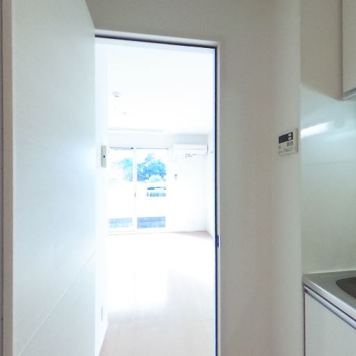 玄関からの採光(確度70%):玄関側の扉または開口部から強い外光が入り、廊下キッチンまで明るい。