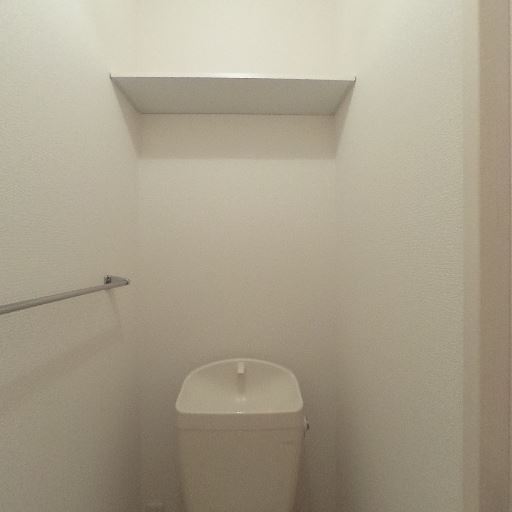 トイレ個室の設備構成(確度91%):タンク付き便器、上部にオープン棚、側面にタオルバーとペーパーホルダー、ドアは内開き。