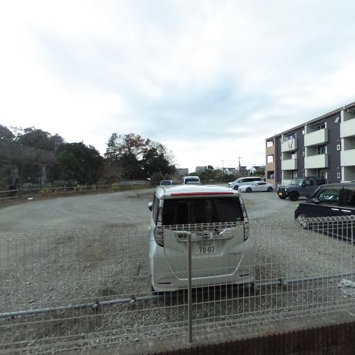 眺望・抜け感(確度77%):敷地の前が広い駐車場で、建物の圧迫感が少なく視界が開けている。