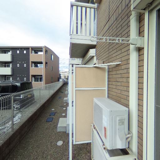 バルコニー/テラスの設備(確度86%):物干し金具とシャッター雨戸が確認できる。エアコン室外機も設置済み。