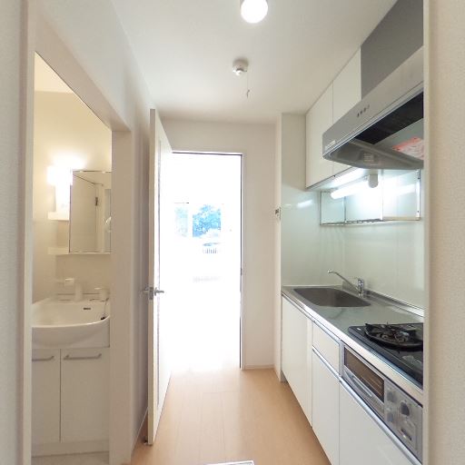 洗面室がキッチン横に隣接(確度78%):左手に独立洗面台が見え、廊下状キッチンの並びで水回りが集約されている。