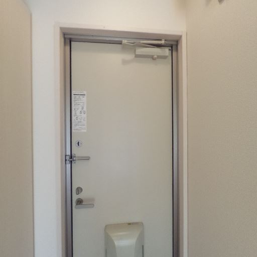 玄関ドアとドアクローザーの状態(確度72%):玄関ドアは金物が整い、ドアクローザーや内側レバー・サムターンが確認でき、見た目は良好。