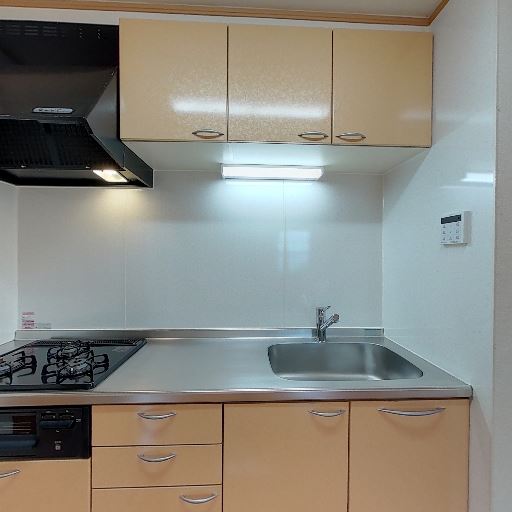 • キッチンの設備(確度82%):ガスコンロ・レンジフード・シンクが一列に配置されたコンパクトなシステムキッチン。吊り戸棚もあり収納がある。