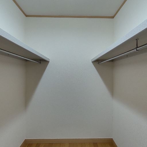 • ウォークインクローゼット(確度90%):左右にハンガーパイプと棚が設置された小部屋状の収納空間。奥行きもあり衣類や小物を十分に収納できそう。