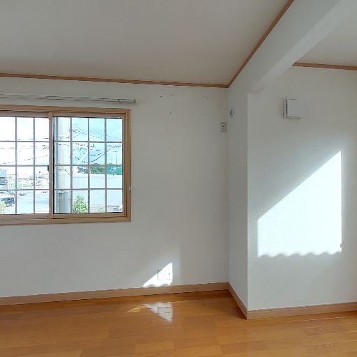 • 明るいリビング(確度87%):掃き出し窓と小窓があり、室内に自然光がしっかり入っている。床の反射からも明るさが確認できる。