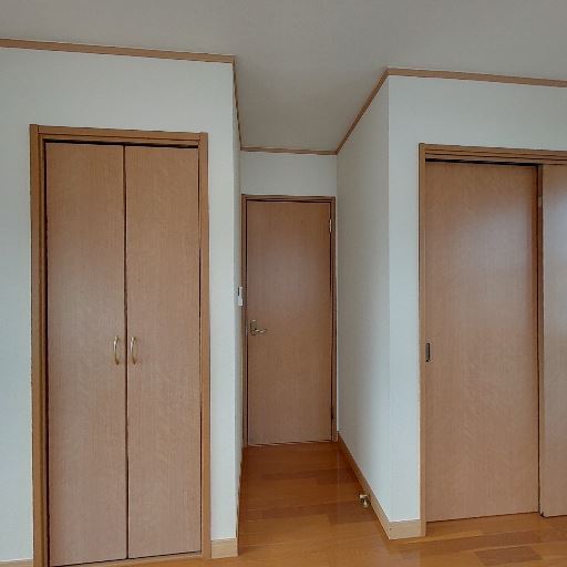 • 収納が充実(確度76%):観音開きのクローゼットと引き戸の収納(もしくは部屋への引き戸)が見える。