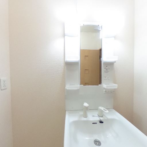 • 照明と換気設備(確度77%):洗面ミラー左右に照明があり、天井には換気扇(もしくは天井設備)が見える。明るさは十分そう。