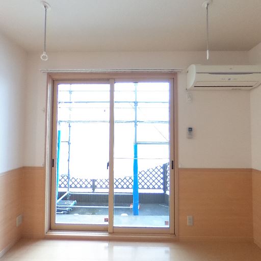 • 大きな掃き出し窓とエアコン設置済み(確度90%):床までの引き違い窓と室内機が確認できる。物干し用の天井吊り金具もある。