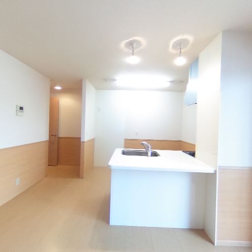 • 対面キッチンと照明器具(確度86%):白いカウンターの対面キッチンがあり、天井にダウンライトとペンダント照明が複数設置。