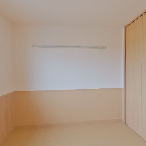 室内物干しレールの存在(確度72%):壁上部に横長のレールがあり、室内干しやフック掛けに使えそう。