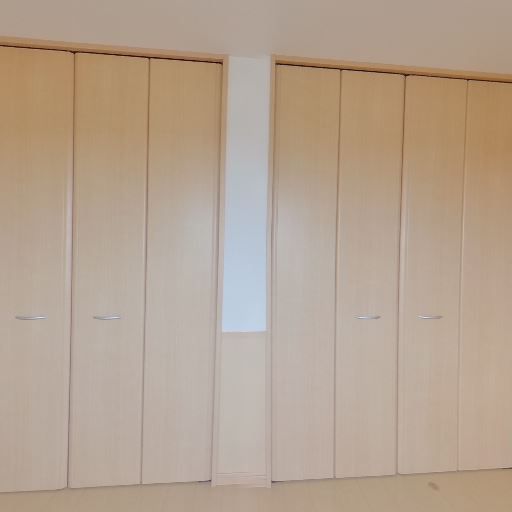 収納量が多いクローゼット(確度88%):壁一面に折れ戸のクローゼットが2区画分あり、十分な収納が確保されている。