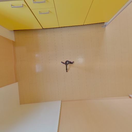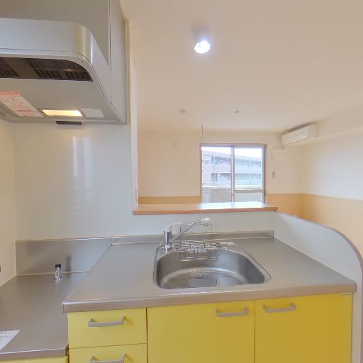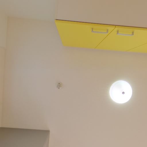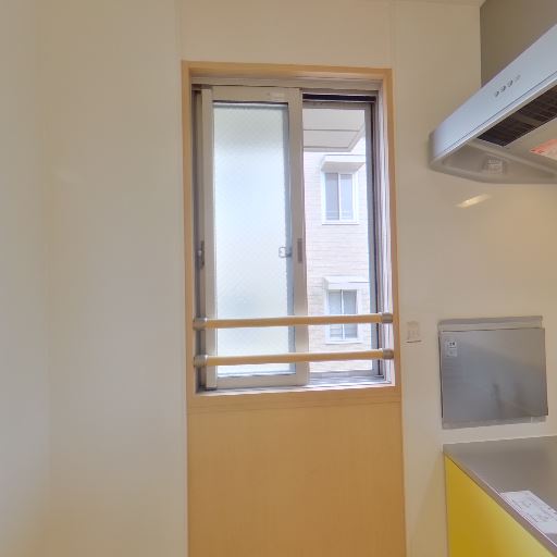 キッチン上部吊戸の視認(確度70%):黄色い吊戸棚が見え、キッチン収納量が確保されている。