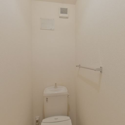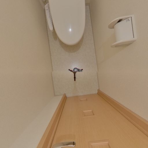 個室トイレ(温水洗浄便座付き)(確度86%):コンパクトな独立トイレ。タンク一体型で、便座横に操作装置が見えるため温水洗浄便座と推測。