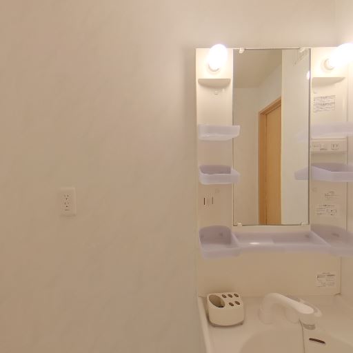 独立洗面台と収納(確度90%):鏡付きの独立洗面台があり、左右に小物用の棚が複数付いている。照明も内蔵。