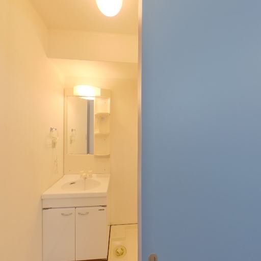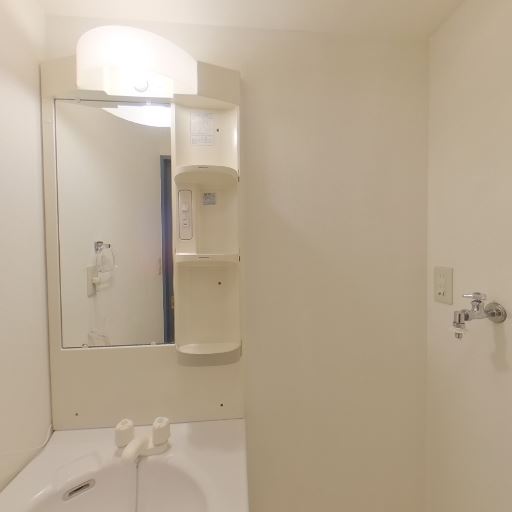 独立洗面台あり(確度88%):廊下側に独立洗面台とミラー収納がある。照明も付いている。