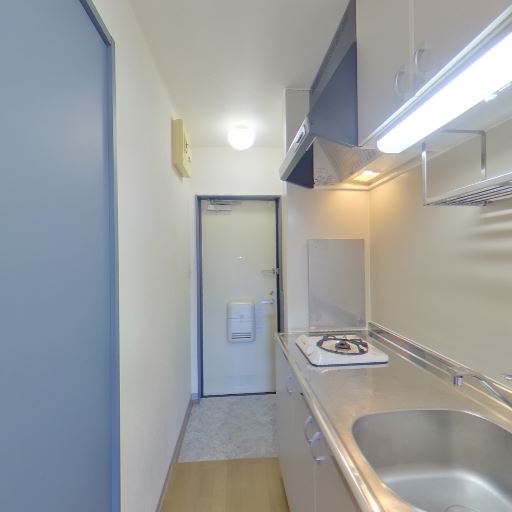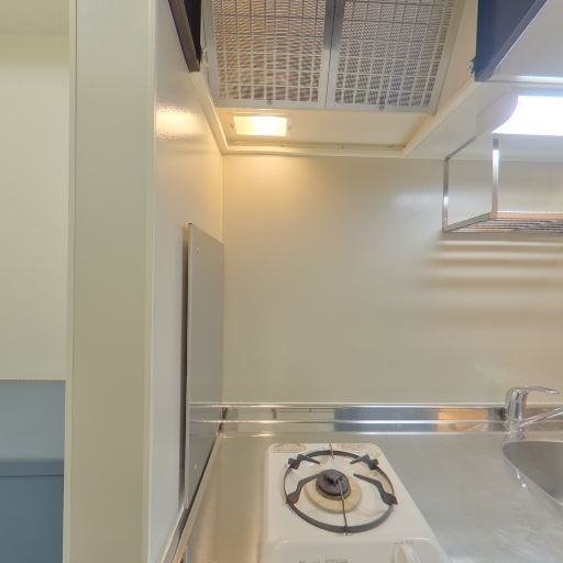 1口コンロのキッチン(確度90%):キッチンはシンクと1口ガスコンロ、上部にレンジフードと吊り棚がある。作業スペースはややコンパクト。