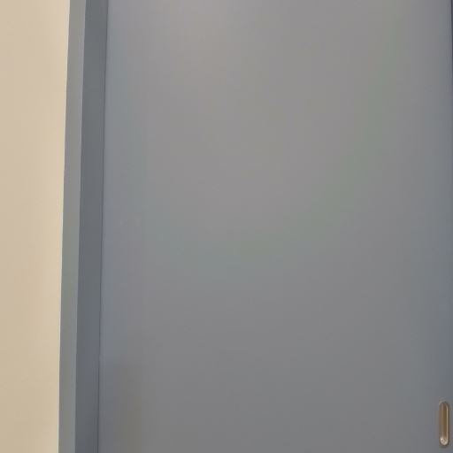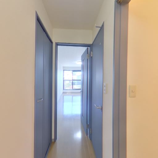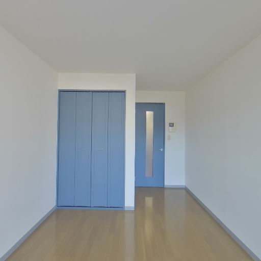 収納スペース(確度80%):扉付きのクローゼットが一面にあり、色はブルー系でアクセントになっている。