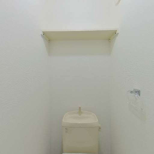 個室トイレの設備(確度90%):洋式トイレと上部棚、ペーパーホルダー、タオルリングが確認できる。