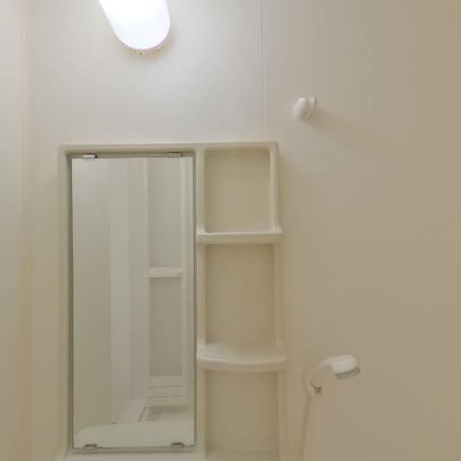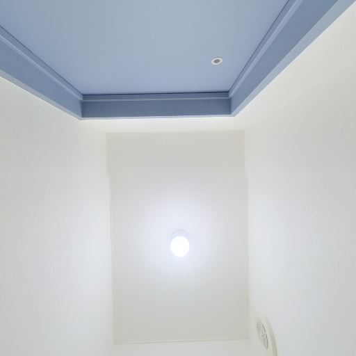 換気・採光(確度58%):天井にダウンライトはあるが窓は見当たらない。換気扇の存在は不明。