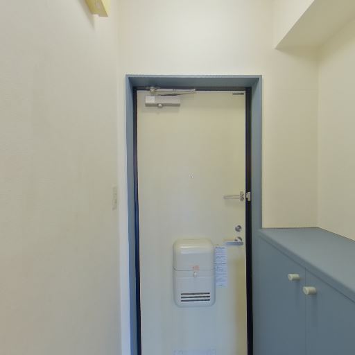 玄関とシューズボックス(確度84%):玄関ドア横に天板付きの収納があり、シューズボックスまたは玄関収納として使えそう。ドアはドアクローザーと郵便受け付き。