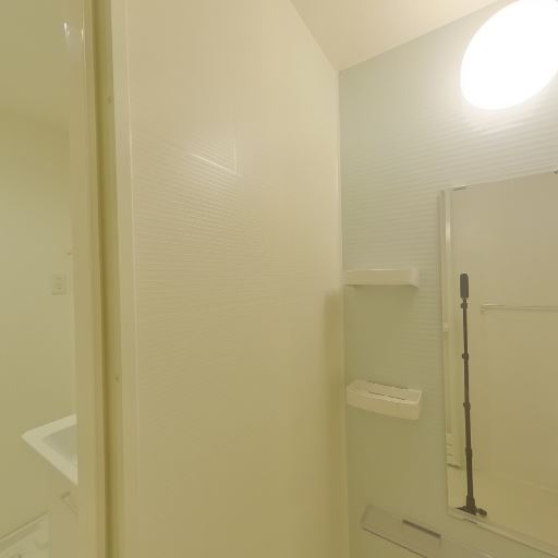 シャワースライドバーとミラー(確度86%):高さ調整可能なスライドバー付きシャワーと縦長ミラーが確認できる。
