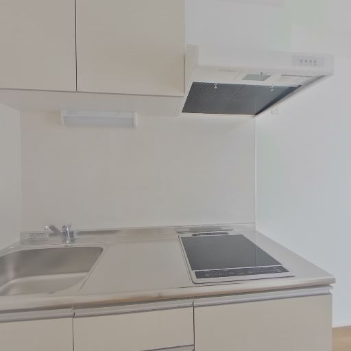 キッチンの設備(確度83%):単身者向けのコンパクトなシステムキッチンで、2口コンロとレンジフード、シンク下収納が確認できる。