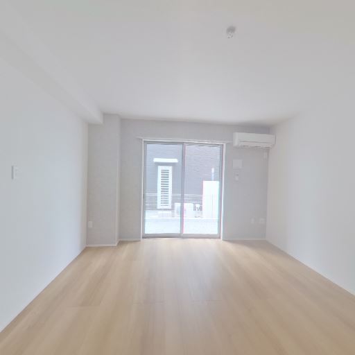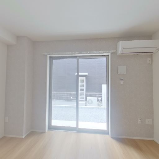 リビングの採光とエアコン設置(確度86%):大きな掃き出し窓があり、室内機エアコンが窓の右上に見える。