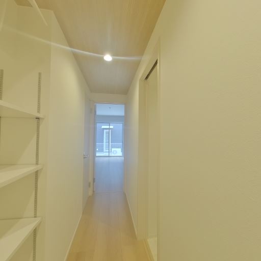 玄関収納・可動棚の充実(確度83%):廊下側に可動式のオープン棚が複数段設置され、玄関脇にもカウンター収納がある。