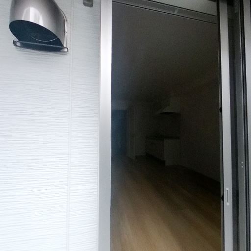 南向きではない可能性と採光状況(確度62%):掃き出し窓はあるが、外は建物の壁と設備が近接しており直射は限定的に見える。室内は全体に明るめだが日照時間は短い可能性。