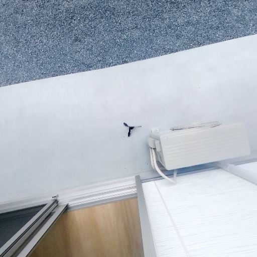 エアコン設置済み(確度95%):掃き出し窓の右上に壁掛けエアコンが設置されている。