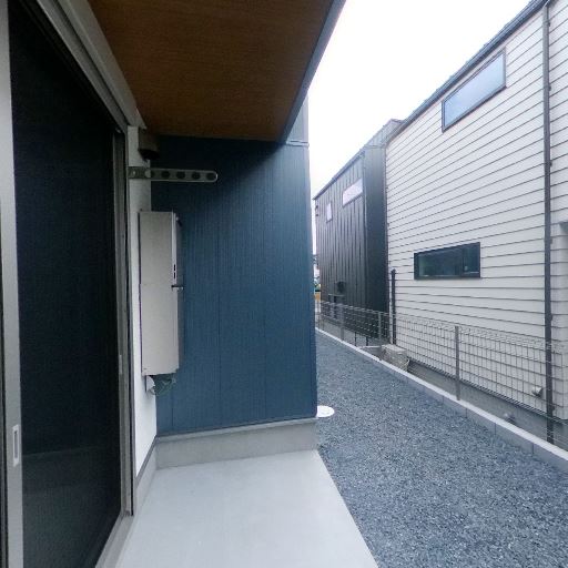 屋根付きバルコニー(テラス)(確度90%):庇が深く、竿掛け金具や物干しバーが設置されている半屋外スペースがある。雨天時もある程度干せる。