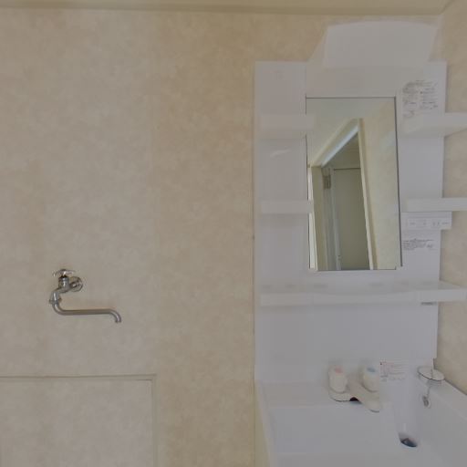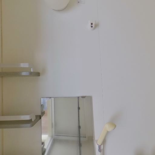 収納・棚の存在(確度73%):洗面鏡の横に2段の棚があり、小物の置き場として使えそう。