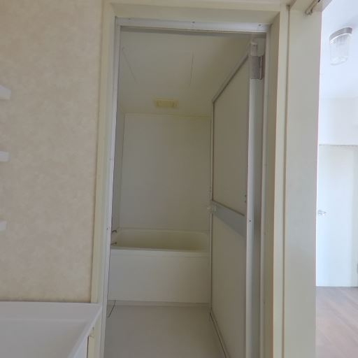 ユニットバスの清潔感(確度78%):浴槽・壁面ともに白基調で大きな汚れやカビは見当たらない。全体的に明るく清潔に見える。