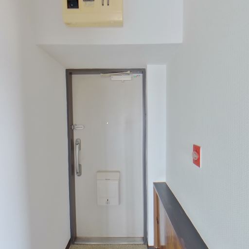 玄関ドアと設備の状態(確度78%):スチールドアに内側ロック、ドアクローザー、郵便受けが付いており、上部にブレーカー盤が見える。全体として大きな傷や錆は見当たらない。