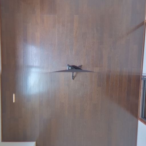 床の仕上げ(確度73%):フローリング床で色はダークブラウン。大きな傷は見当たらない。